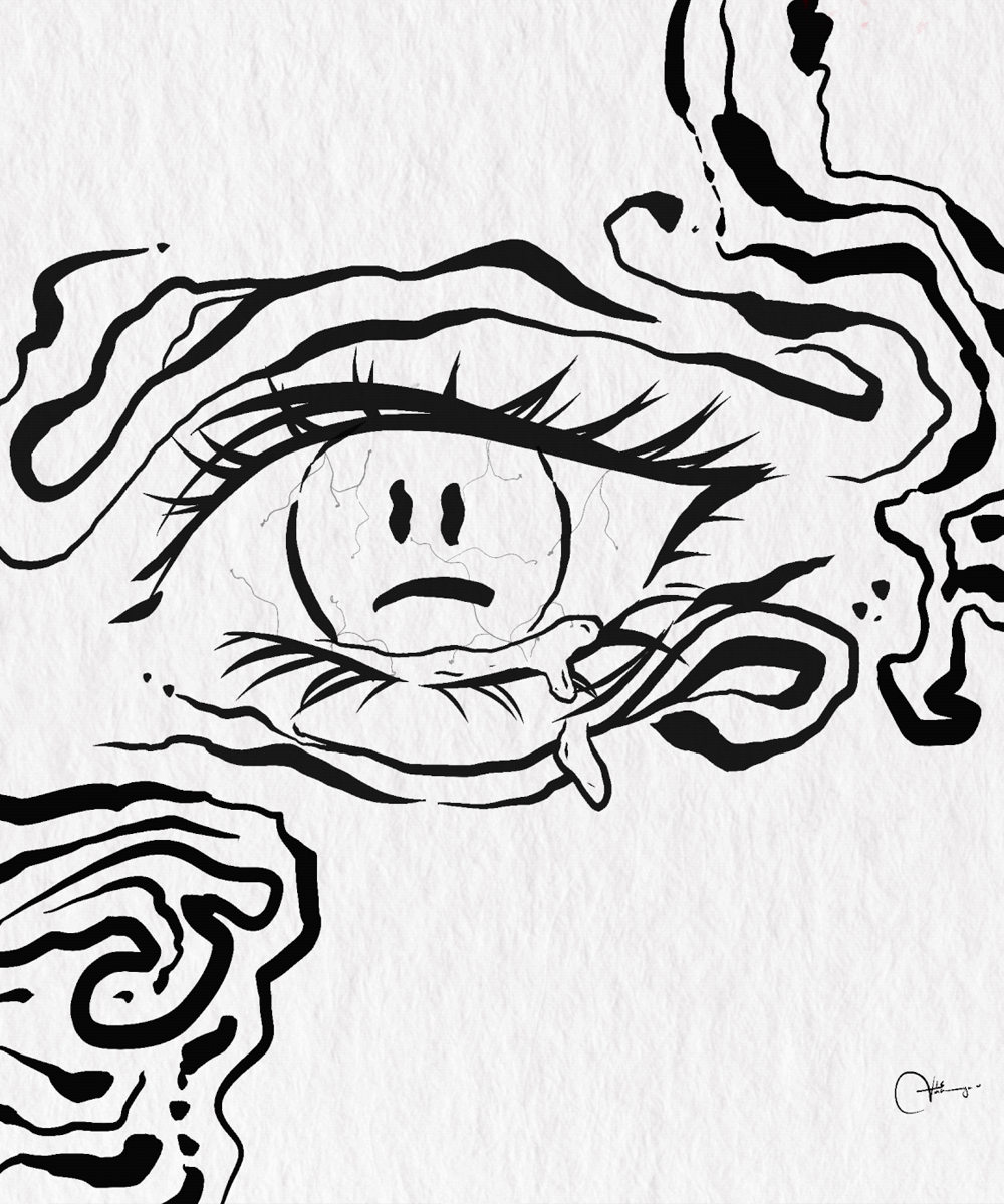 Create a GIF of a hand-drawn eye where a tear falls down while a smiley face is subtly visible on the eyelid when the eye blinks.